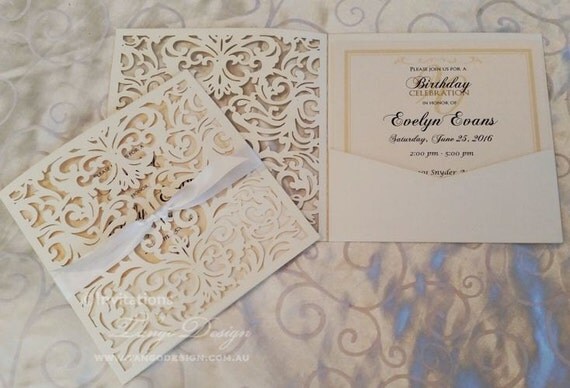 Invitacion de bodas con diseno cortado a laser con lazo satinado atado en un moño. Invitaciones para bodas elegantes.
